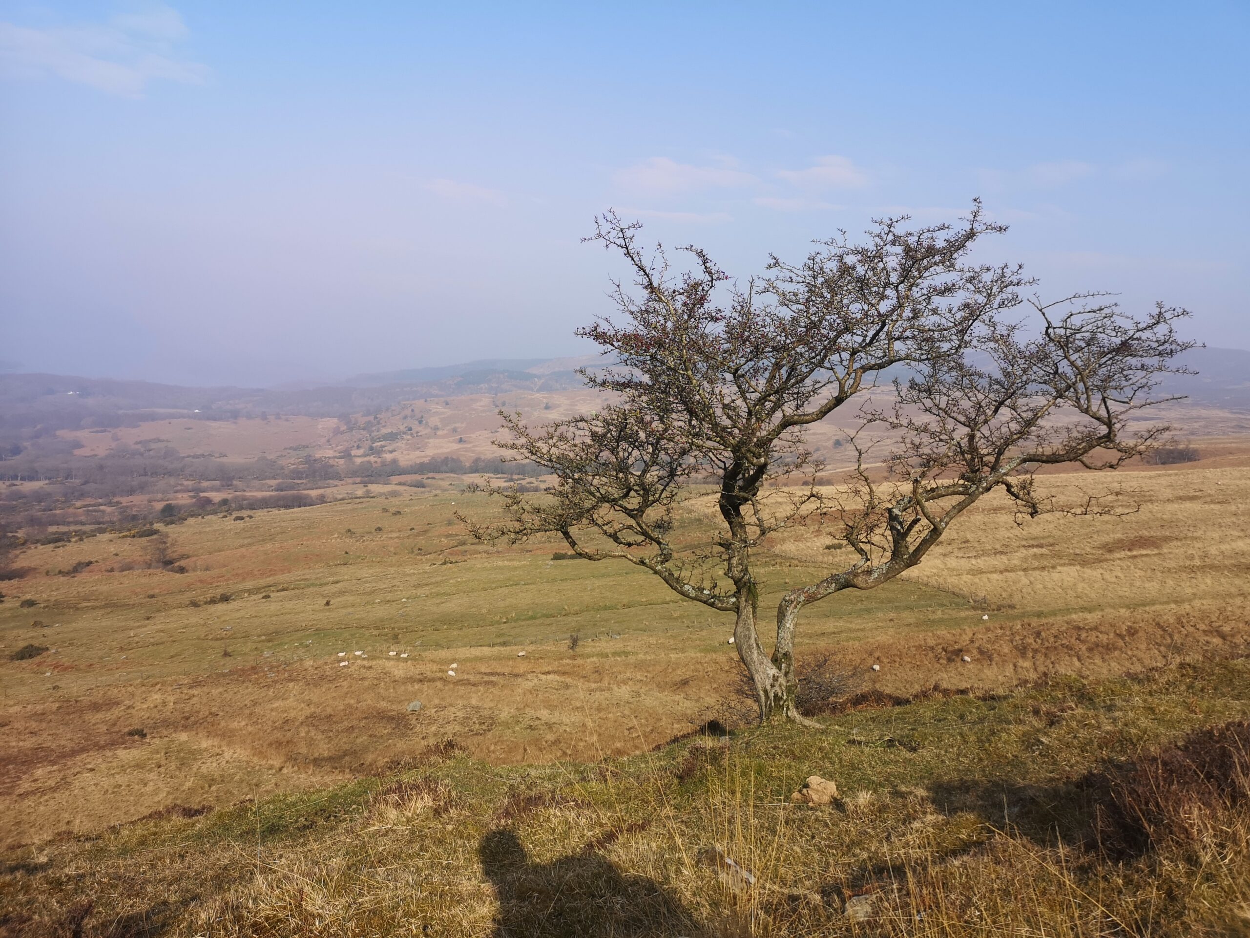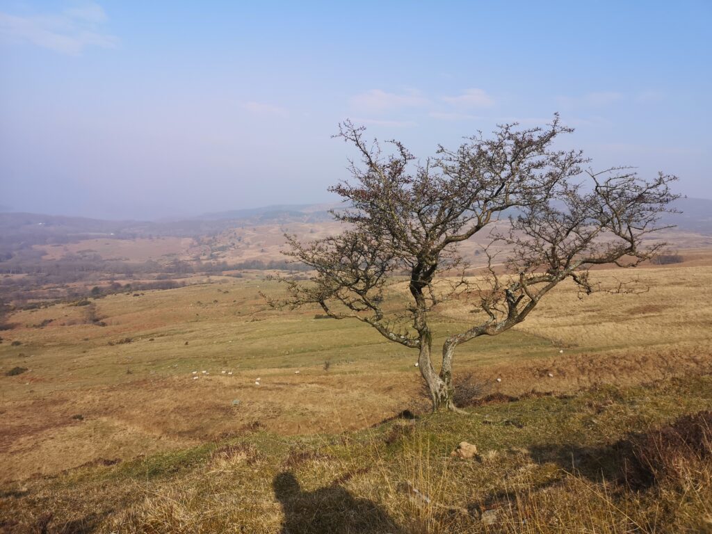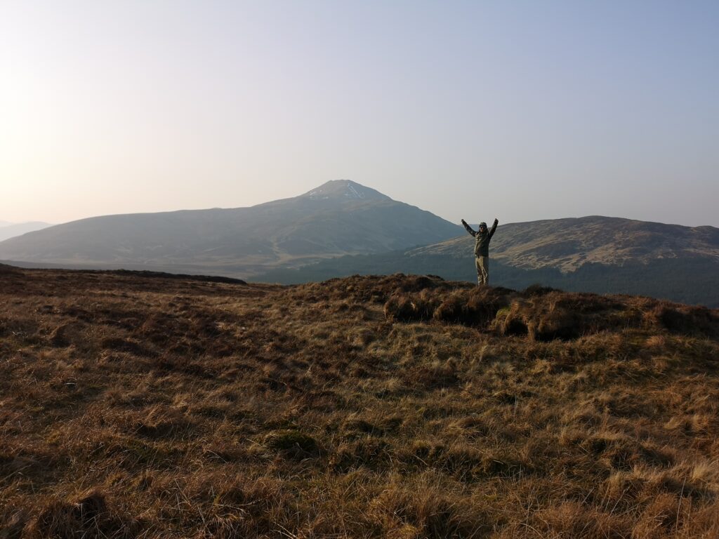 Auf dem nächsten Gipfel machen wir Mittagspause mit Powernap. Die Querung war doch anstrengender als erwartet. Die Aussicht ist toll, am Horizont sind in Dunst gehüllte Berge zu erahnen und im Vordergrund liegt Loch Lomond. Das alles bei strahlendem Sonnenschein, kurzer Hose und einem Nutellabrötchen – ich kann mein Glück kaum glauben. Schottland hatte ich mir so ganz anders vorgestellt. In einem Wort: Regen. Selbst dem guten Wetterbericht hatte ich nicht so wirklich getraut.