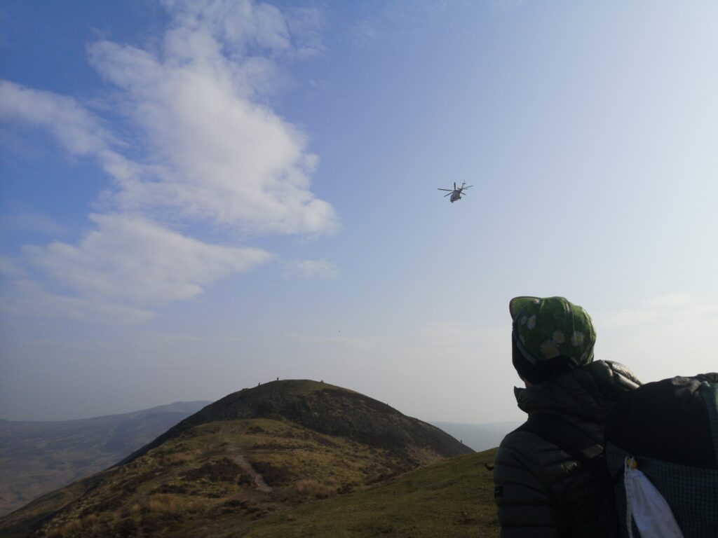 Wir besteigen den Conic Hill von der Rückseite durch ein Nebental. Nach und nach öffnet sich uns dabei die Bergkette, die sich entlang des Loch Lomond zieht. Wir erhalten einen fabelhaften Ausblick über eine Hochebene, die teils sehr sumpfig aussieht und auf der ab und an eine Gruppe Schafe grast. Conic Hill hält was er verspricht. Wir sind auf dem Gipfel fast alleine und ich genieße den Ausblick über Loch Lomond. Es ist faszinierend, wie sich die Hügelkette, auf der wir uns befinden, auch im See noch fortführt. Sie verläuft quer durch den See, manche Inseln sind mit Steeg und Haus, anderen scheinbar unbewohnt. Die Häuser sehen idyllisch aus und ich ertappe mich dabei, mir vorzustellen, dort zu leben. Das tiefe Dröhnen eines nahenden Helikopters reist mich aus den Gedanken. Ein Rettungshelikopter der Marine steuert langsam aber sicher auf unsere Bergkuppe zu. Kurz in Panik schaue ich nach dass wir nicht zufällig den SOS-Knopf unseres Satelliten-Senders aktiviert haben – dies ist zum Glück nicht der Fall. Der Helikopter fliegt über uns hinweg, dreht eine Runde und landet kurz auf einer nahen Kuppe, um ohne irgendwas getan zu haben wieder abzuheben. Ein Crewmitglied winkt uns beim wegfliegen noch aus der geöffneten Seitentüre und schon ist der Heli hinter dem nächsten Berg verschwunden.
