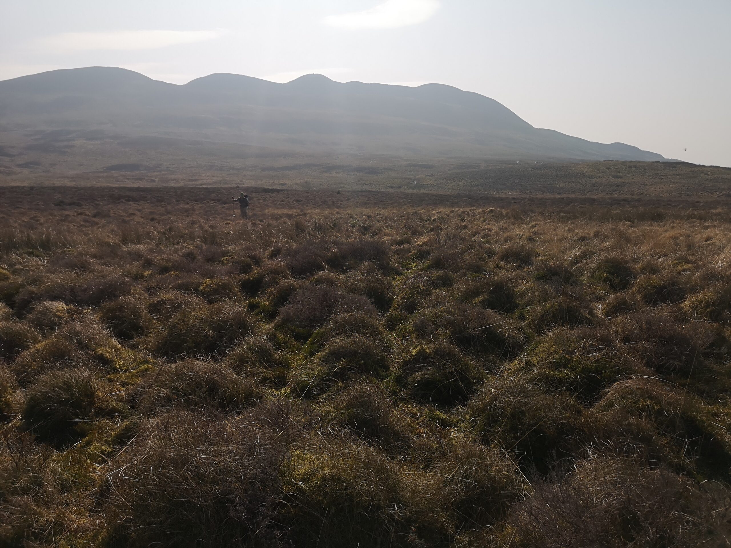 Der Boden ist durchtränkt mit Wasser und überwuchert von Bodengestrüpp oder getrockneten Grasballen. Dadurch ist jeder Tritt ein Tritt ins Ungewisse. Erwartet mich harter Boden oder sinke ich 10cm in schlammigen Wasser ein? Es fühlt sich so an, als seien wir richtige Abenteurer und durchqueren die Wildnis Schottlands. Spaß machts, aber anstrengend ist es allemal! Unsere wasserdichten SealSkin Socken beweisen wieder ihre Fähigkeiten und bald bemerken wir, dass die Schafe sich kleine Trampelpfade gemacht haben, die einen festen Tritt versprechen. So kommen wir gut voran, stoßen Irgendwann auf die Spur eines Quads, die in die richtige Richtung geht und folgen dieser bis auf die andere Seite des Tals. Auch auf die Hügelkette, wir die wir erklimmen wollen, führt eine feuchte Fahrspur.