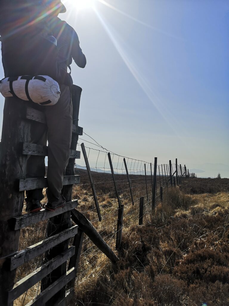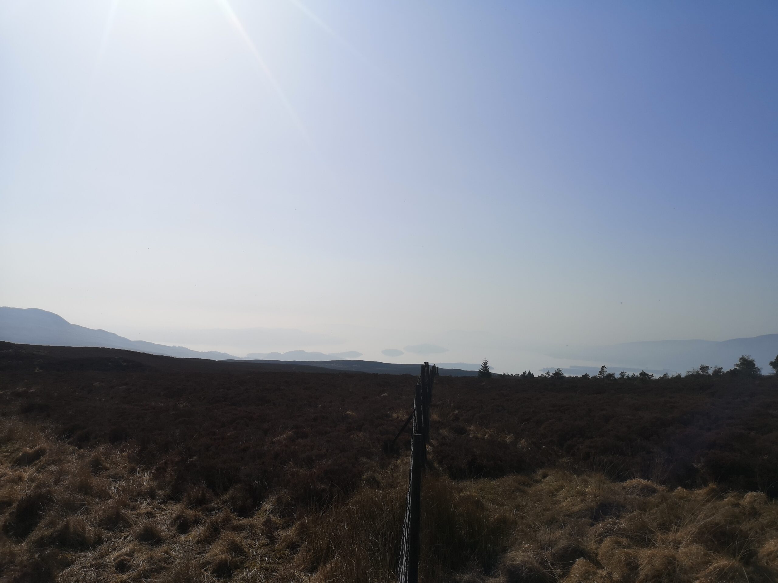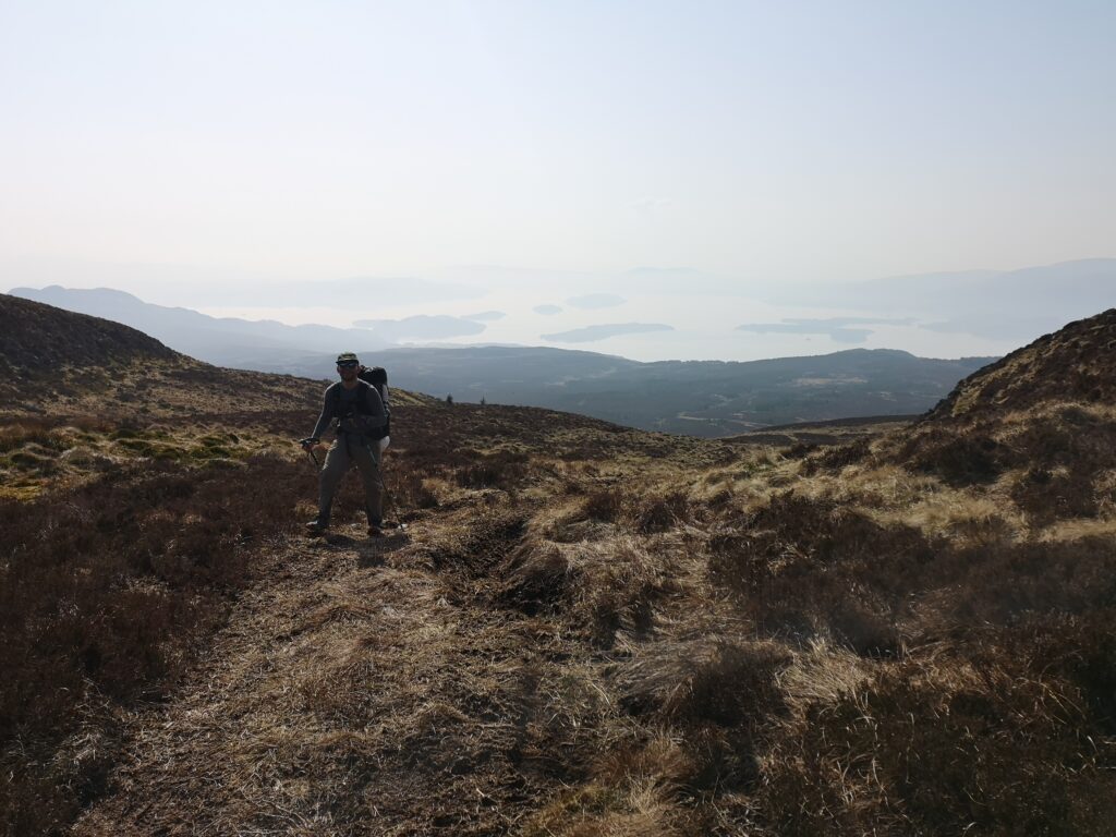 Frisch gestärkt und erholt folgen wir einem ehemaligen Schafszaun durch das unwegige Gelände auf den nächsten Berg. Von dort aus wollen wir heute noch zum Ende dieses Bergrückens laufen, um morgen früh wieder auf den West Highland Way zu stoßen und Ben Lomond zu besteigen.