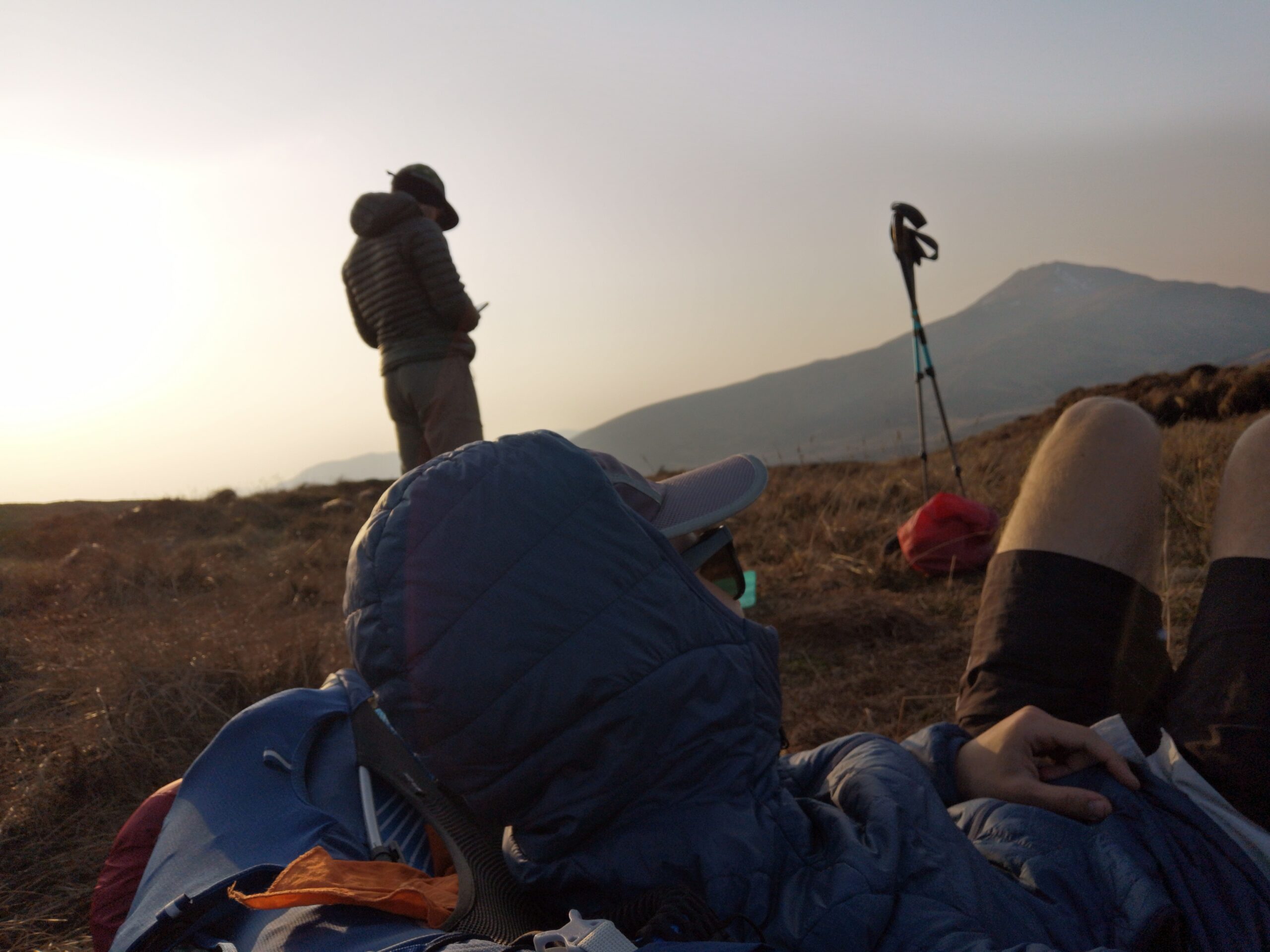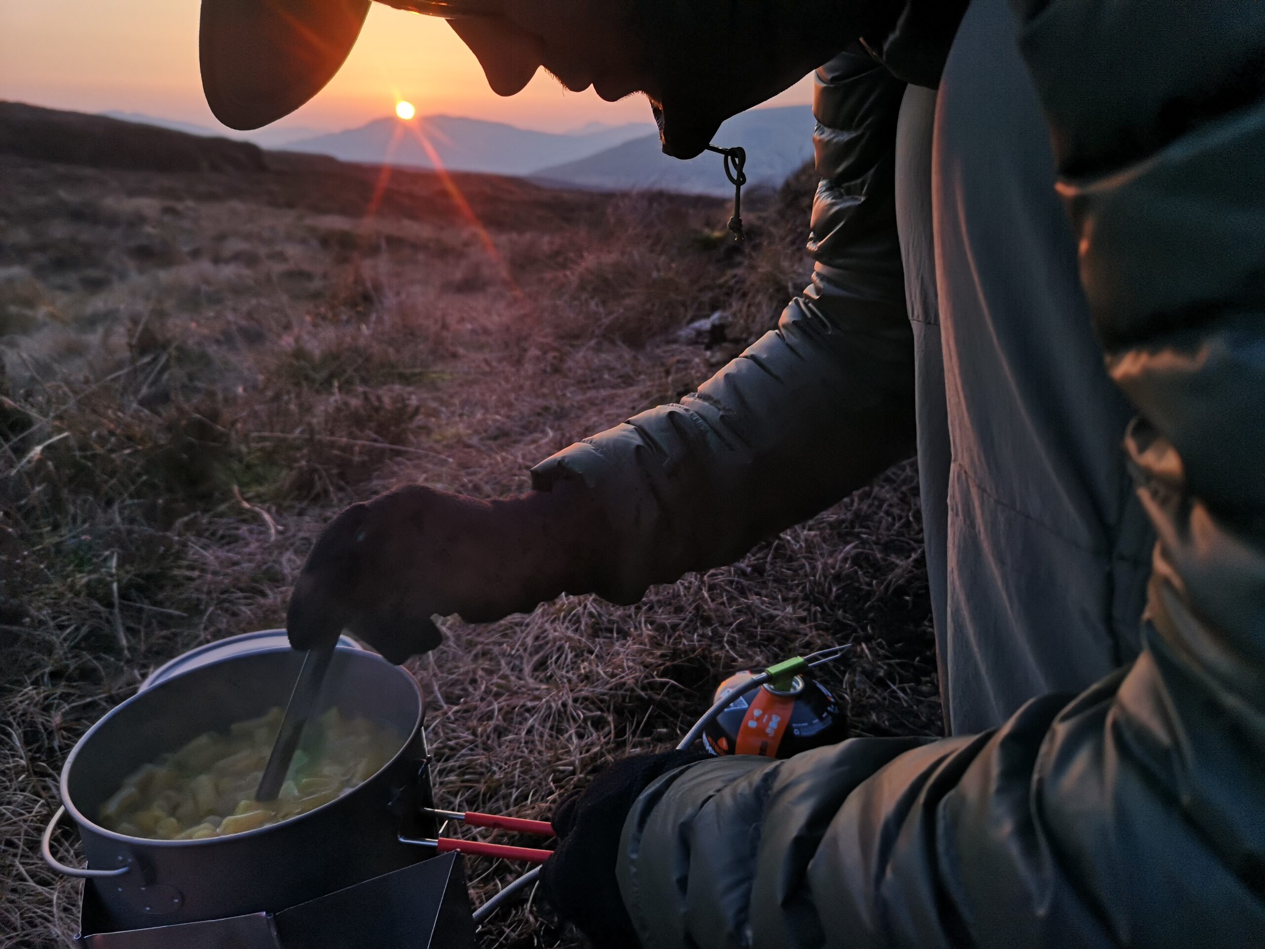 Irgendwann kommen wir dann ermüdet an unserem angepeilten Campingbereich an. Nach kurzer Suche finden wir tatsächlich einen trockenen, flachen und moosigen Fleck für unsere Zelte. Bei traumhaftem, wenn auch etwas kaltem Sonnenuntergang gibt es wässriges Mac’n’Cheese, das bei weitem nicht an amerikanisches Instant Mac’n’Cheese heranreicht, aber trotzdem einigermaßen sättigte. 😢 Tot Müde bin ich anschließend in den Schlafsack gekrochen und habe mir meinen wohl verdienten Schlaf abgeholt.