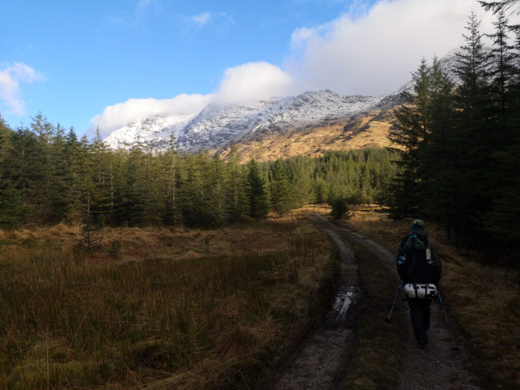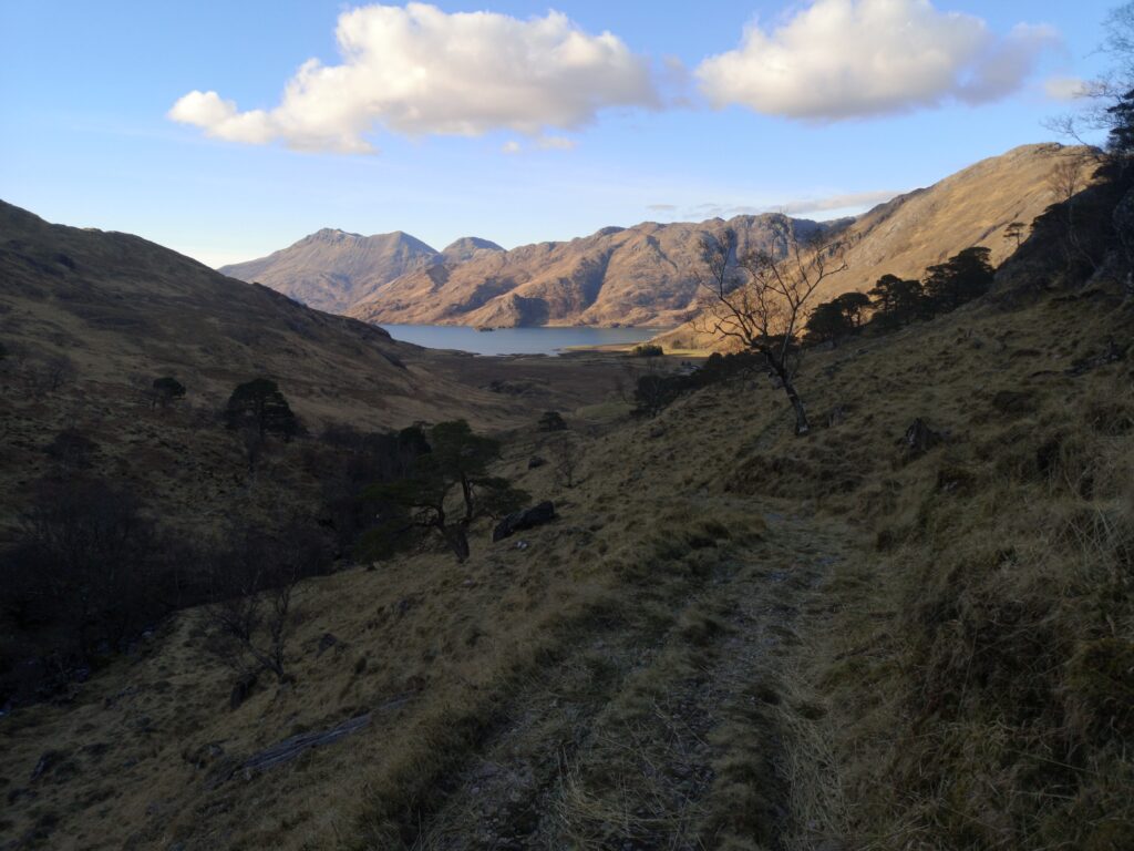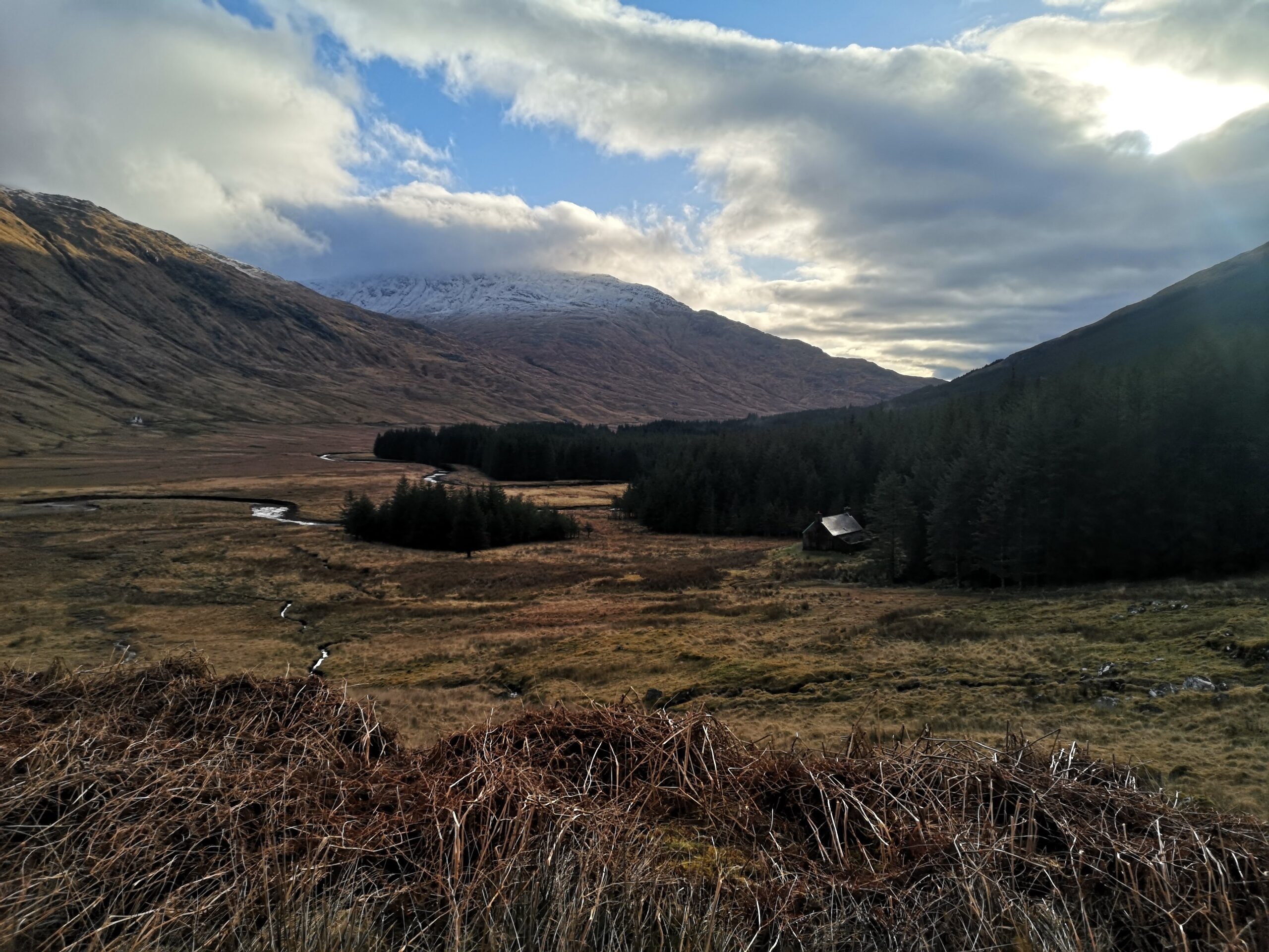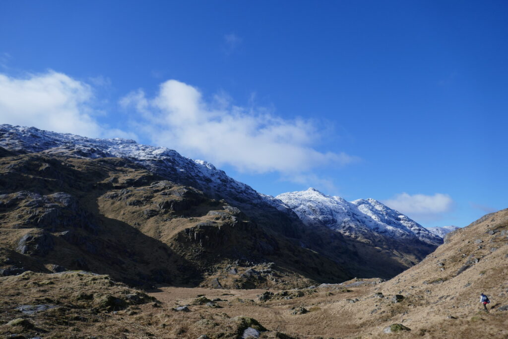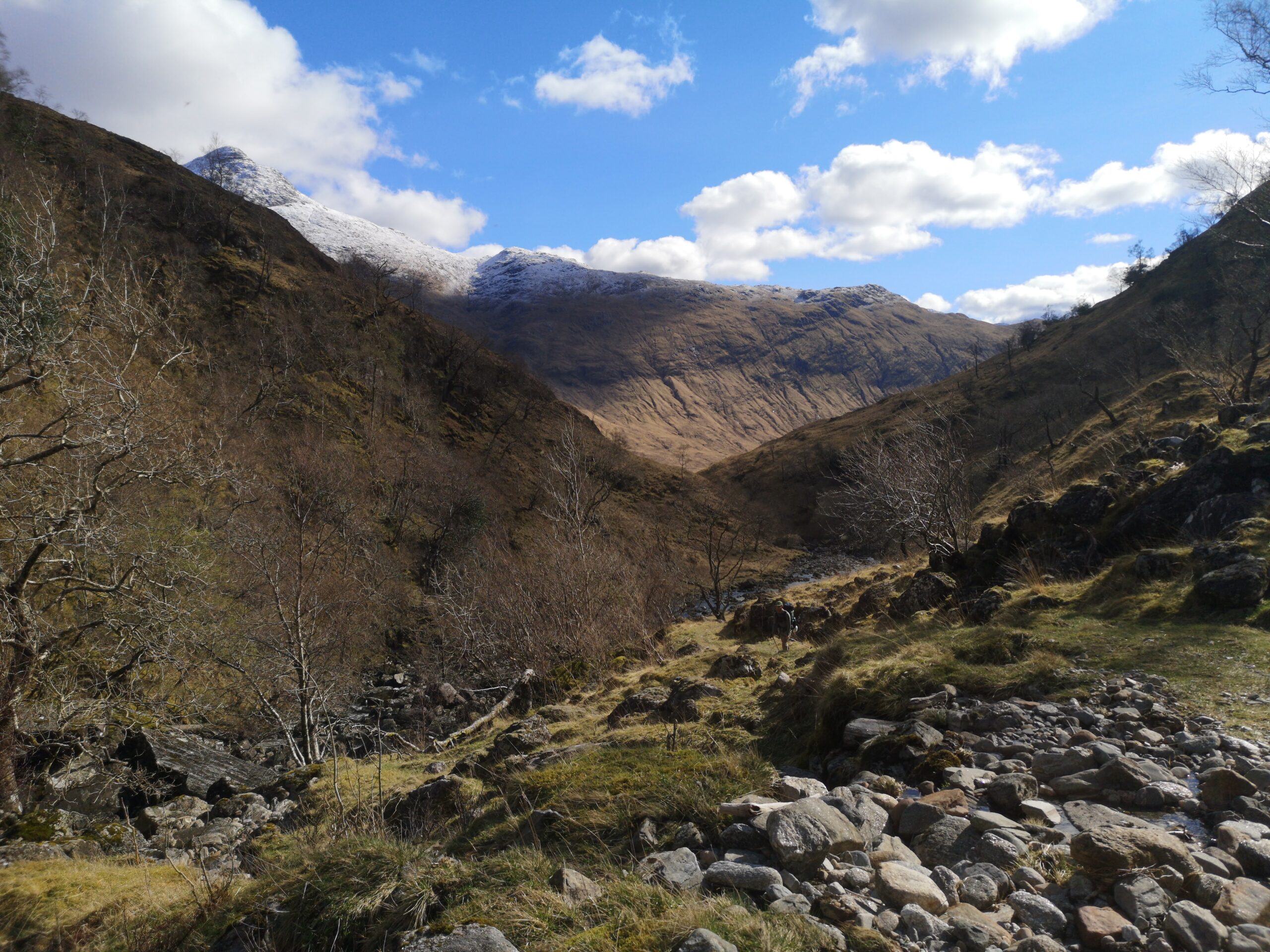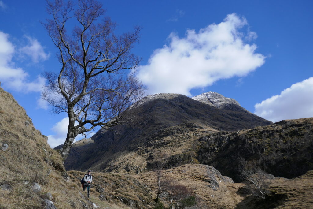 Ein Feldweg führt uns das Tal hinauf. Das Wetter ist super und so legen wir nacb ein paar Minuten die erste Stripeinlage hin. Wir laufen durch einen Nadelwald, eine Seltenheit in Schottland. Dann kommen wir wieder ins Freie und ich bin beeindruckt von der Natur. Wir sind in einem menschenleeren Stück Gebirge. Die Berge sind weiß und strahlen in der Sonne. Ein See glitzert im Sonnenlicht. Wir beschließen Mittagspause zu machen, genau hier wo es so toll aussieht.
