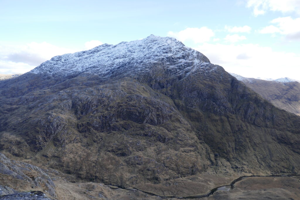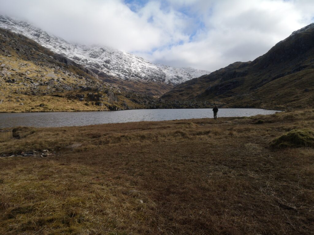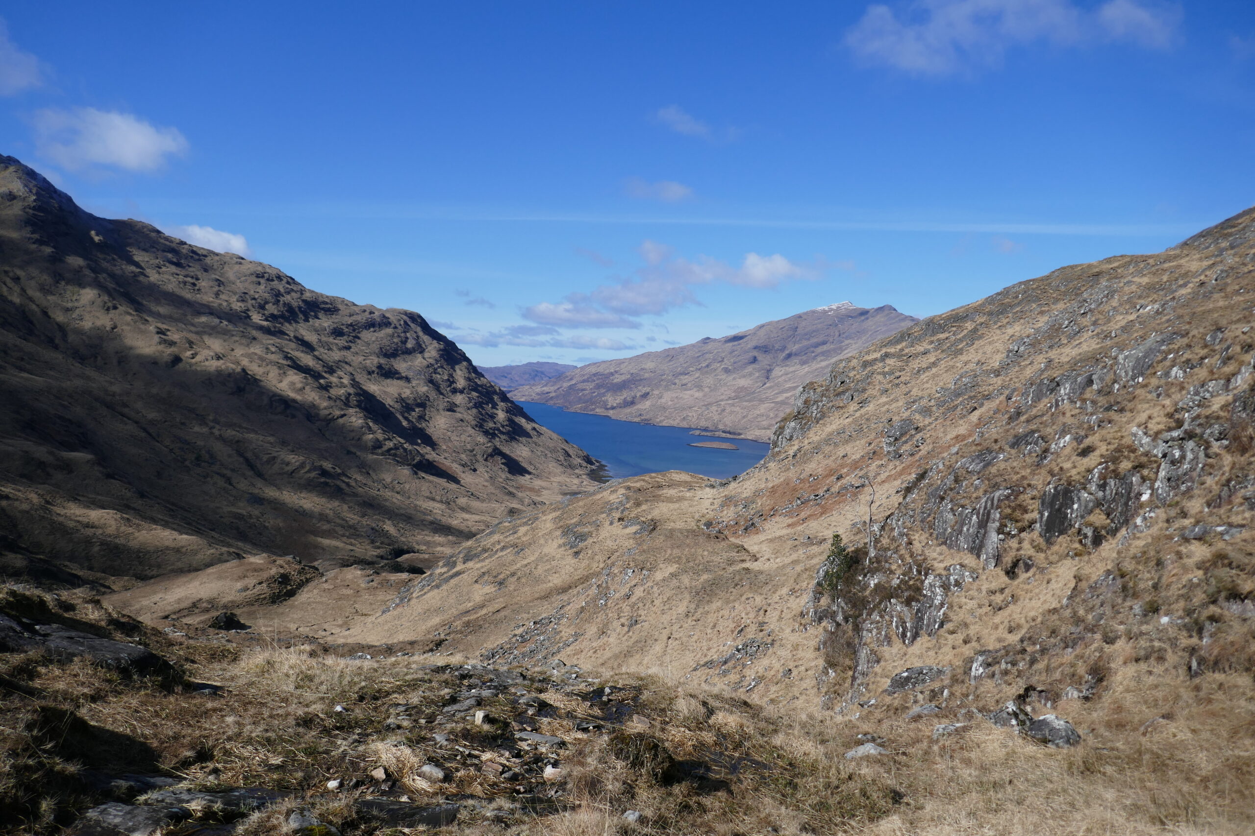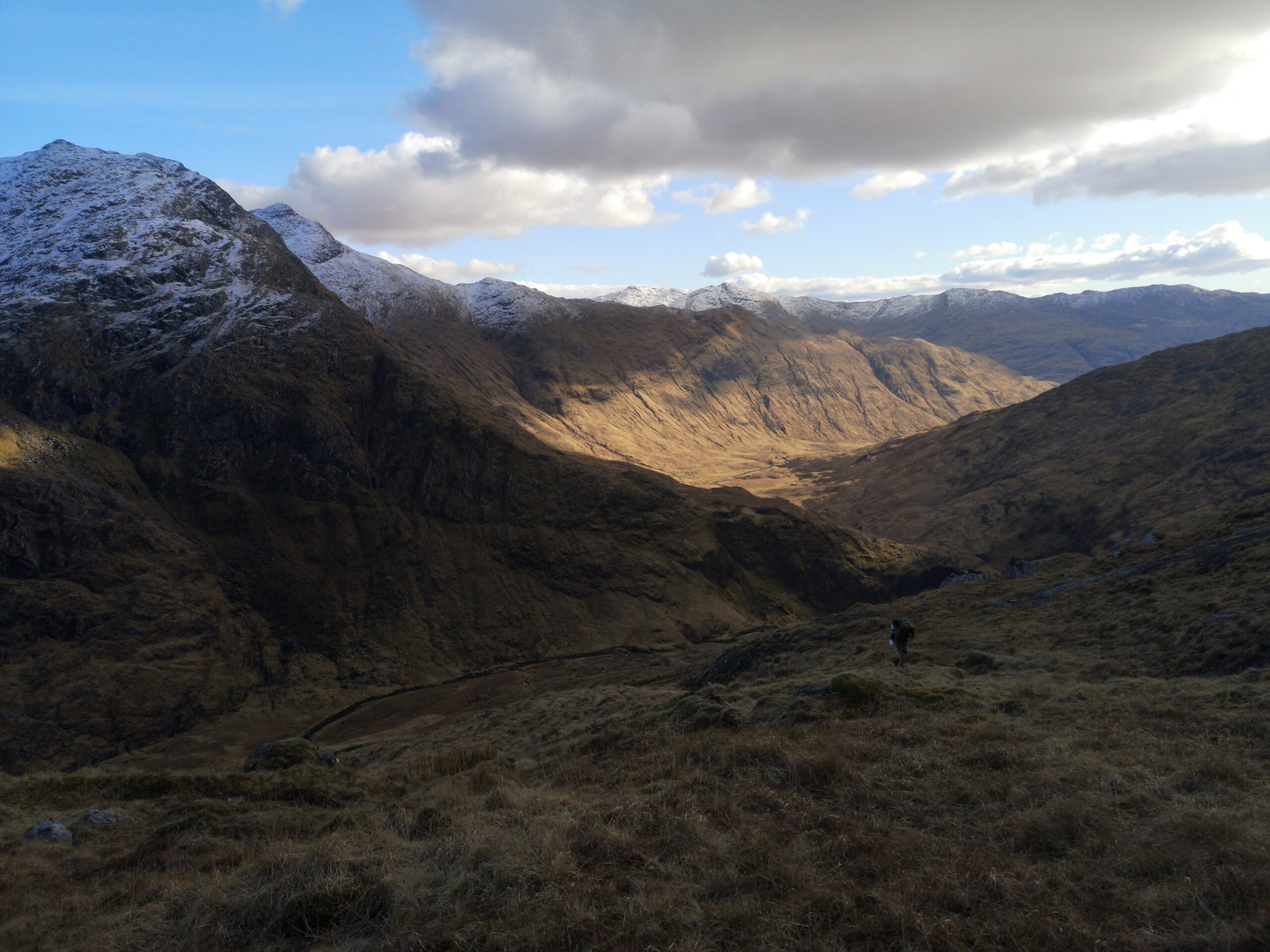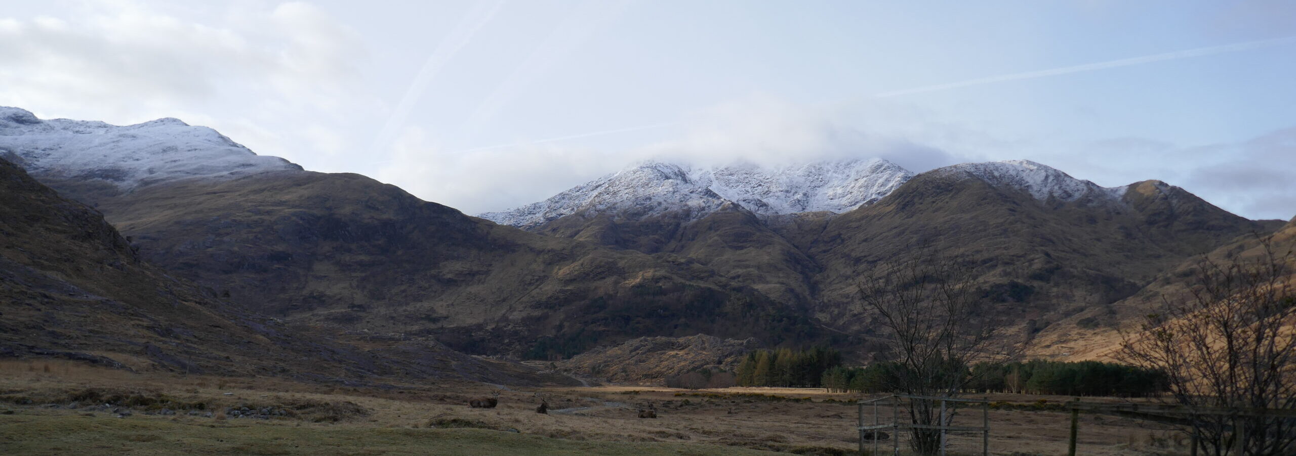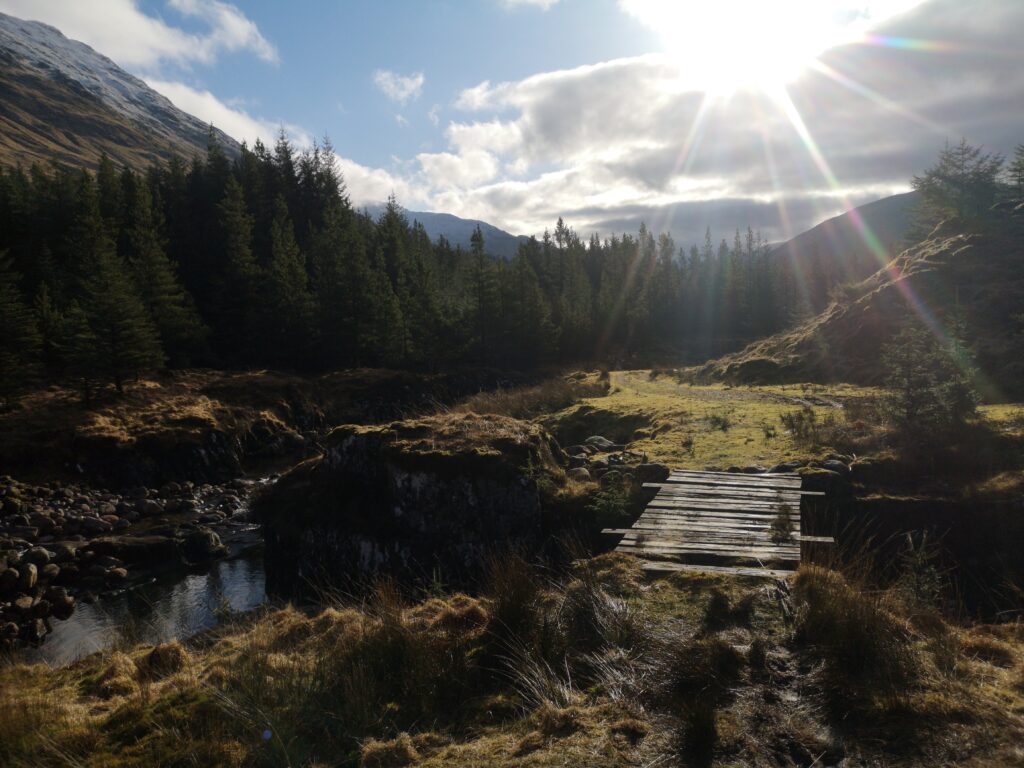Ein Feldweg führt uns das Tal hinauf. Das Wetter ist super und so legen wir nacb ein paar Minuten die erste Stripeinlage hin. Wir laufen durch einen Nadelwald, eine Seltenheit in Schottland. Dann kommen wir wieder ins Freie und ich bin beeindruckt von der Natur. Wir sind in einem menschenleeren Stück Gebirge. Die Berge sind weiß und strahlen in der Sonne. Ein See glitzert im Sonnenlicht. Wir beschließen Mittagspause zu machen, genau hier wo es so toll aussieht.