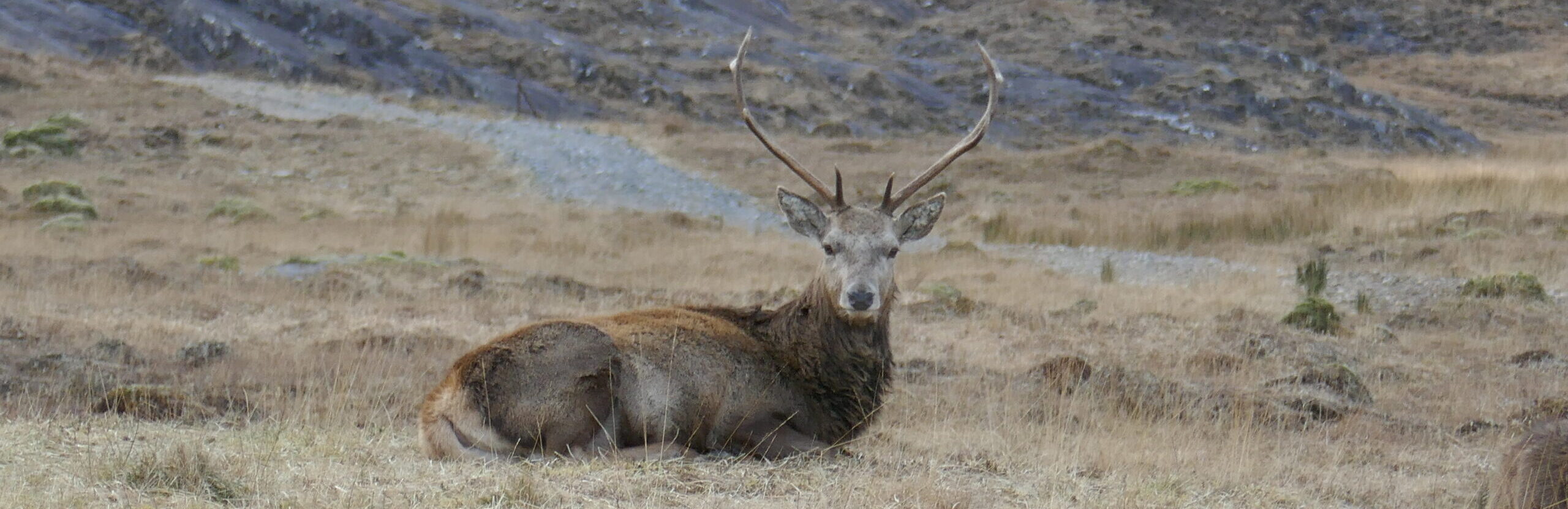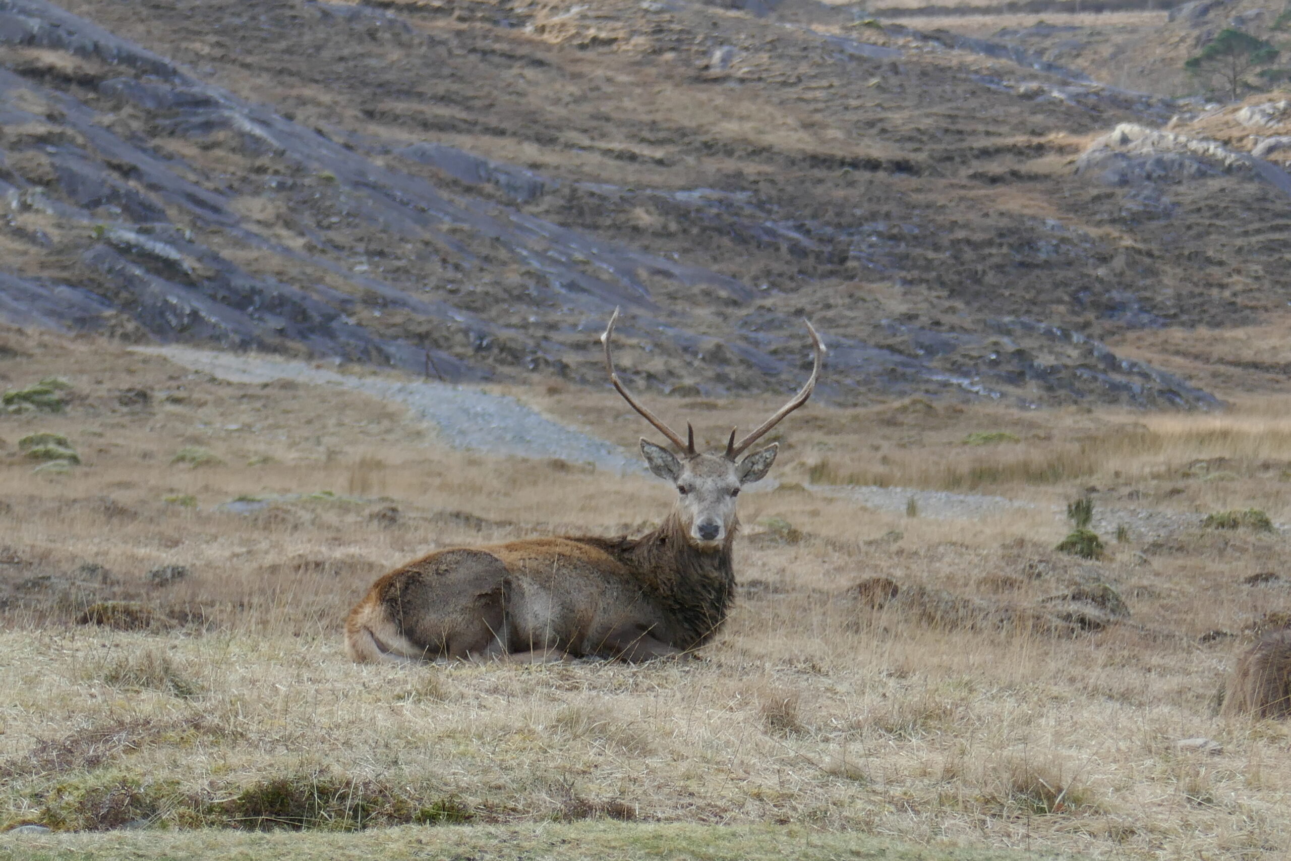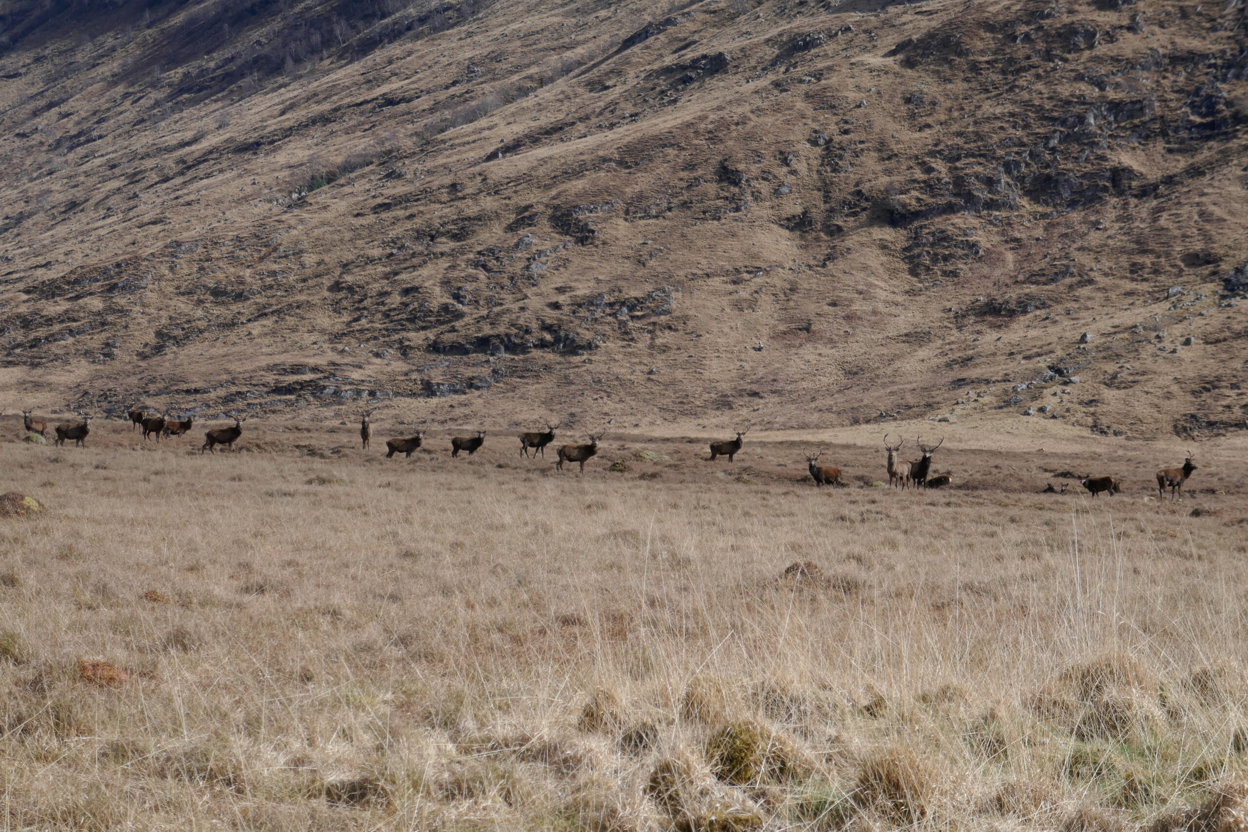 Dann biegen wir ab und laufen ein breites Tal hinauf. Plötzlich sind überall Hirsche. Sie stehen rum und essen Gras oder schauen uns an. Es sind bestimmt 200 Stück. Wir laufen mit pochendem Herzen langsam mitten hindurch. Ich frage mich, ob Hirsche wohl gefährlich sind. Große Geweihe haben sie auf jeden Fall, eigentlich möchte ich keine Bekanntschaft mit den Geweihen machen. Aber sie gehen uns zum Glück ein bisschen aus dem Weg und nach einiger Zeit kann ich es genießen. Sowas passiert nicht alle Tage, total verrückt.