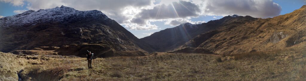 Weiter geht es entlang des breiten Tals. Der Boden ist an manchen Stellen ziemlich schwammig und ich bin froh um meine Seal Skinz. Wir füllen unsere Wasservorräte auf und biegen nach links in ein kleines Seitental ab. Es geht entlang eines Flüsschens. Auf Wildpfaden und mit mancher Kletterpartie. Das Flüsschen wird immer kleiner. Am Ende des Tals machen wir eine kurze Pause und genießen die Natur. Ich finde es sieht aus wie bei in den Rittern der Tafelrunde. Neben dem Bach stehen kleine knorrige Bäume, das Tal ist sehr schmal und an einer Seite von einer Felswand abgeschlossen.