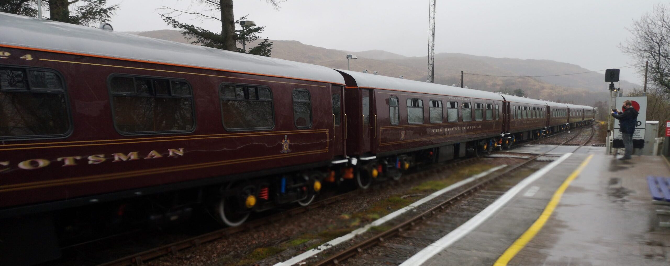 In Strathcarron steigen wir aus und können beobachten, wie der Royal Scotsman an uns vorüber fährt, bevor wir uns auf einen zweistündigen Roadwalk im Regen einlassen.