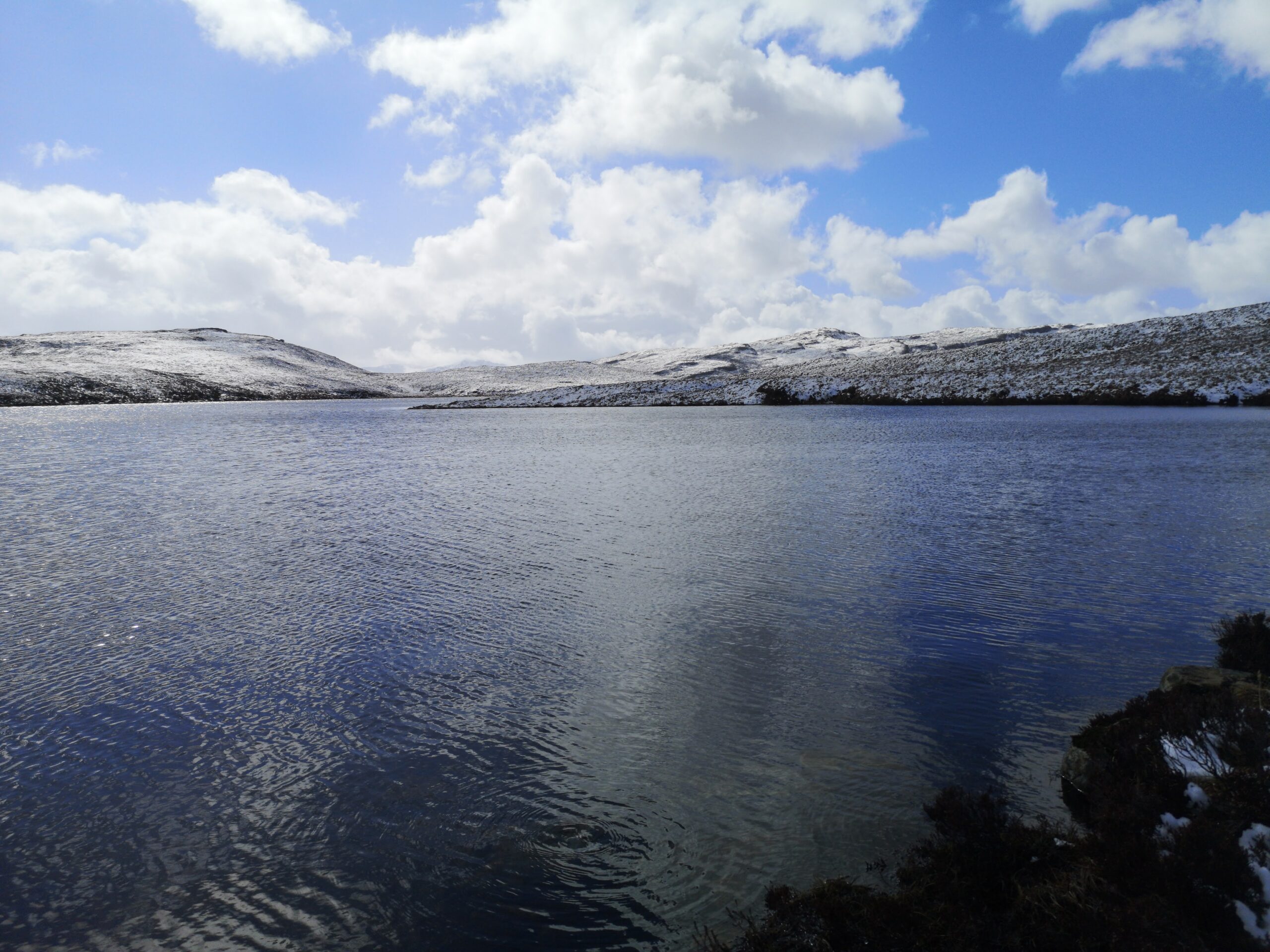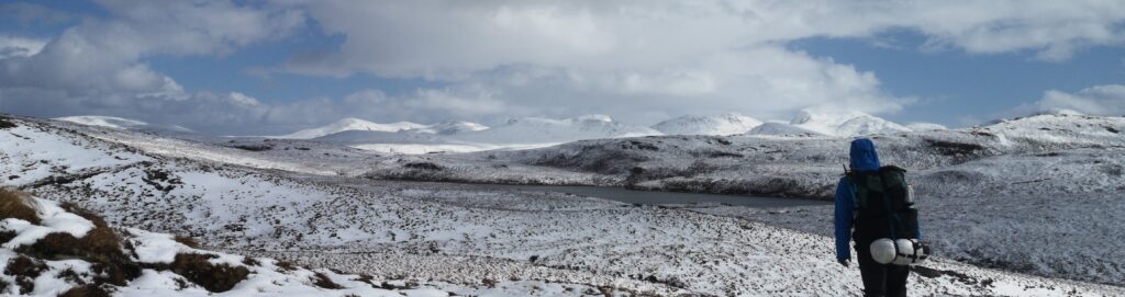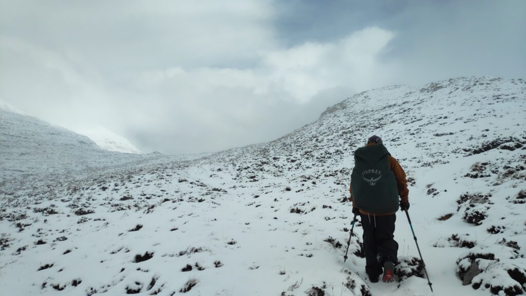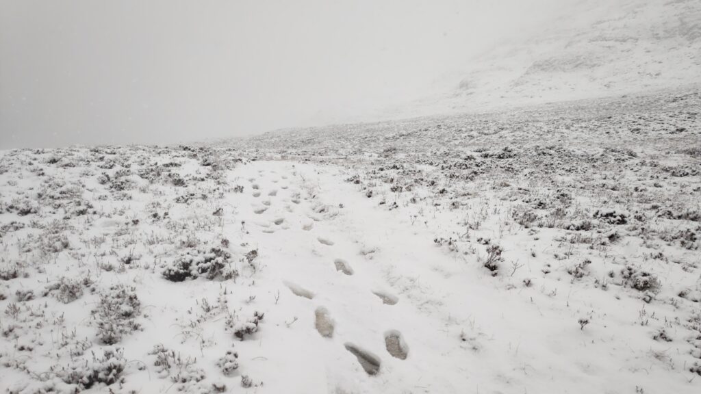 Es schneit. Und das nicht gerade wenig. Die Flocken sind groß und schwer. In diesem Schneetreiben brechen wir von Shenavall auf. Später werden wir verwundert angeschaut, als wir erzählen, dass wir hier alleine übernachtet haben. Man sagt uns, dieses Bothy sei eigentlich immer gut besucht. Und das trotz des zugigen Schlafbodens im ersten Stock. Immer wenn man den Wind hörte, wie dieser am Dach entlang saust, wusste man, dass eine Sekunde später eine leichte Brise über das Gesicht schmeicheln würde. Eine sehr skurrile Erfahrung, sagt das Gehirn einem doch, man liegt in einem Haus und das darf gar nicht passieren.