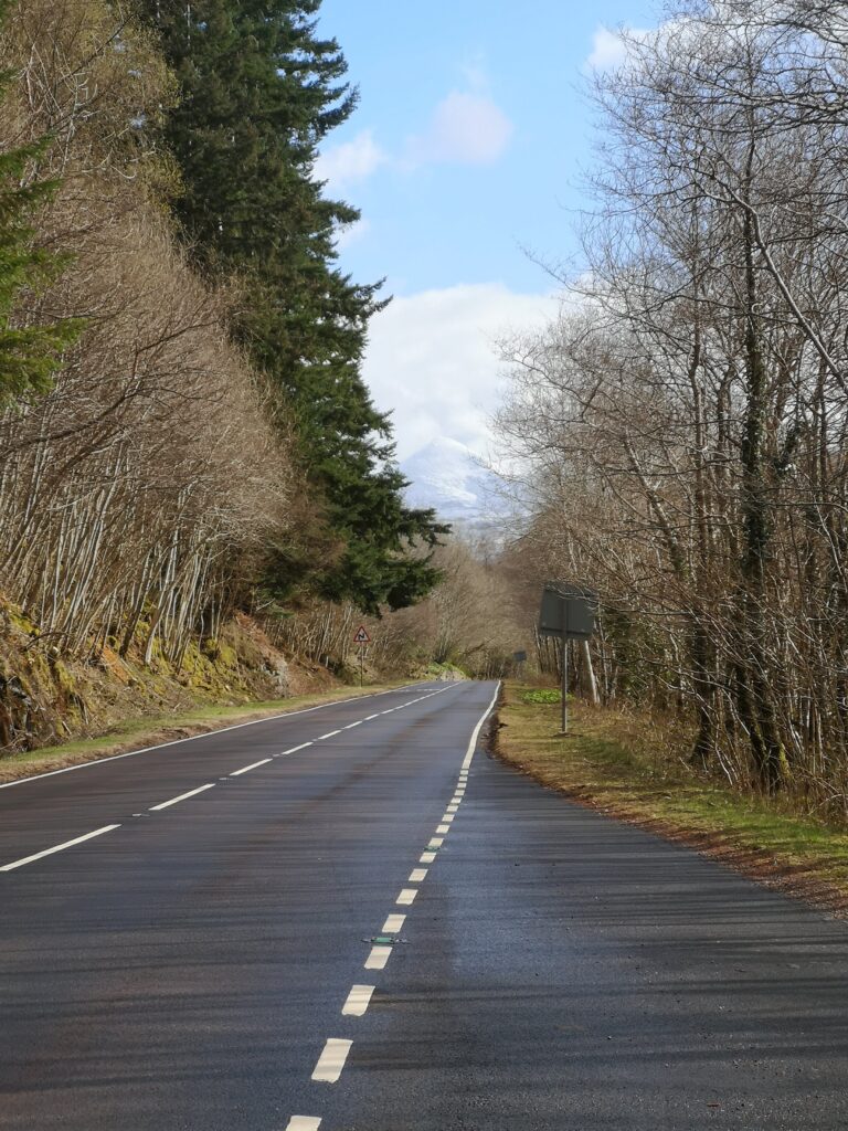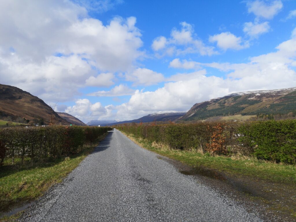 Durch das Tal verläuft eine der rar gesäten Straßen und wir überlegen, wie wir die 15 km nach Ullapool am einfachsten zurücklegen. Auf der Straße laufen kommt für mich nicht in Frage, da meine Füße und Beine durch den steilen Abstieg bereits ziemlich durch sind. Laut Fahrplan sollte ein Bus die Straße entlang kommen und wir haben die Hoffnung, obwohl keine Haltestelle vorhanden ist, diesen herauswinken zu können. Der Bus erscheint jedoch auch eine halbe Stunde nach Fahrplan nicht. Unser Versuch zu trampen ist auch von wenig Erfolg gekrönt, hierbei haben wir heute wohl nicht so viel Glück. Letztendlich bestellen wir uns ein Taxi.