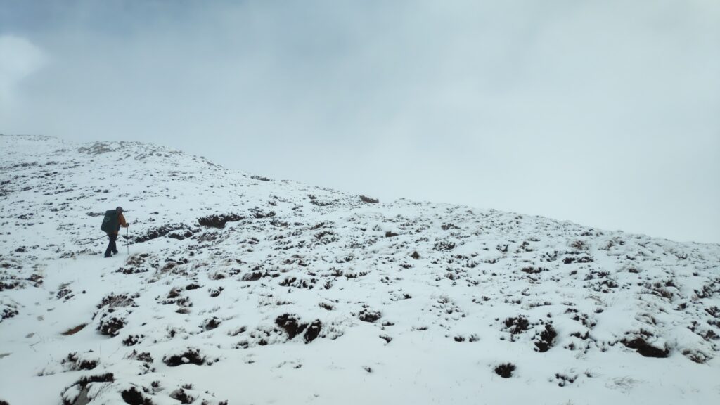 Der Vormittag war anstrengend. Im Schneegestöber haben wir mehrmals den in gutem Wetter bereits schwer auszumachenden Weg verloren und der feuchte Boden zusammen mit Knöchel tiefem Schnee sorgte für einen sehr unrunden und ungewissen Tritt. Wir sind dabei größtenteils im Nebel gelaufen. Ich fand das etwas enttäuschend, da ich mir das schöne Schneepanorama gut vorstellen konnte, welches wir gerade verpassten.