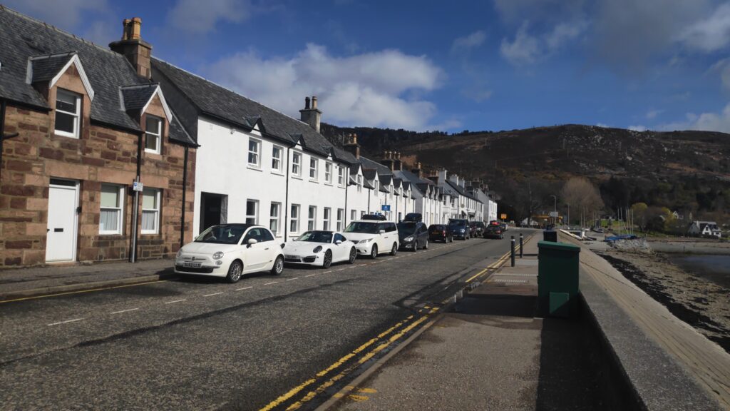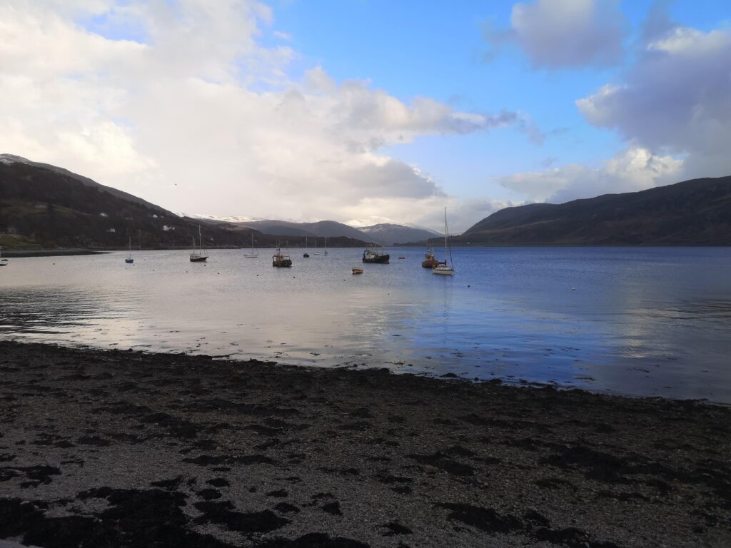 Dieses liegt direkt an der Uferpromenade mit Blick auf den kleinen Hafen ins Landes Innere. Hinter dem Meerarm Loch Broom erheben sich die Berge, in denen wir vorhin noch unterwegs waren.