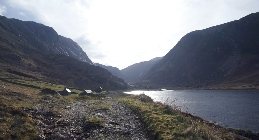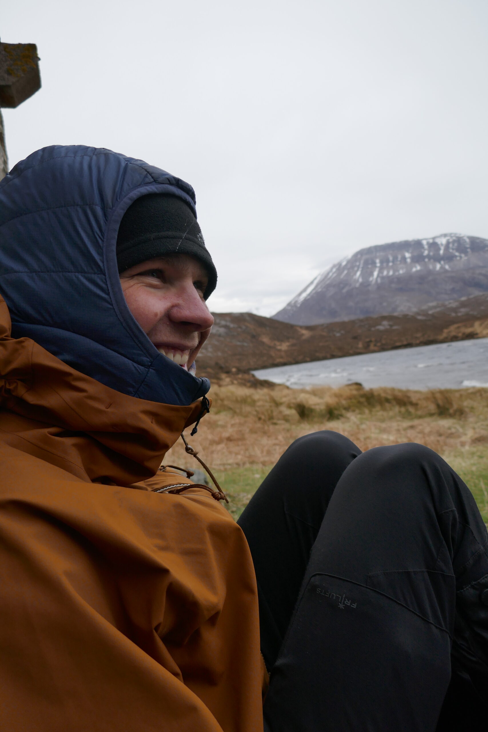 An einer Fischerhütte machen wir eine kurze Pause für ein zweites Frühstück. Die Hütte liegt mit Blick auf einen idyllischen Bergsee. Der See schreibt sich Loch an Leathaid Bhuain und wir haben mal wieder keinerlei Ahnung, wie man dies korrekt ausspricht. Mittlerweile sind ein paar mehr Wolken aufgezogen und der Wind hat aufgefrischt. Mit zwei Riegeln im Magen geht es nach einer halben Stunde faulem Lenz weiter.