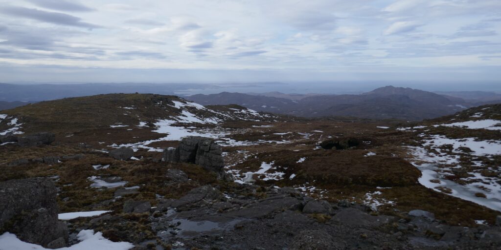 Gesagt, getan. Der Weg führt nun über einen zerklüfteten Bergrücken und ich komme mir ein wenig wie in Mittelerde vor. Es dauert erstaunlich lange, bis die Highlands uns den Blick aufs Meer und das gesamte Panorama freigeben. Der weite Gipfel besteht aus dicken, flachen Granitplatten und der Wind fegt so stark, dass man nicht mehr gerade stehen kann. Alleine durchs hochspringen wird man schon um einiges nach hinten getragen.
