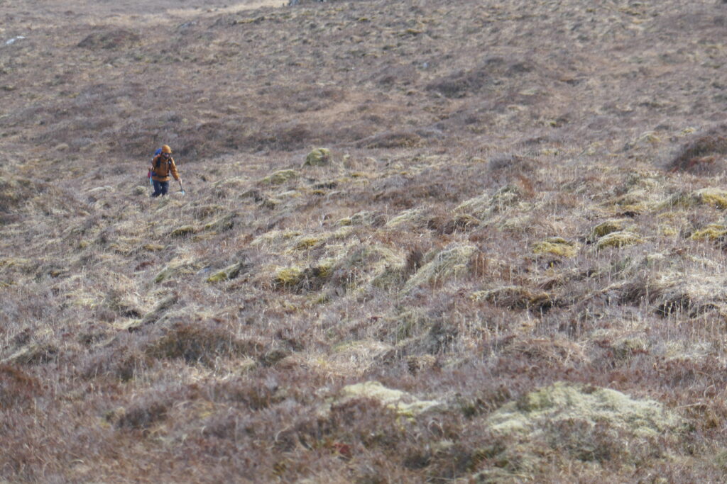 Nun würde der weglose Teil der Etappe beginnen. Von hier oben können wir bereits den Weg im Tal erahnen, den wir ansteuern sollen. Es sieht gar nicht mal so weit entfernt aus und der Absteig dorthin scheint auch in Ordnung. Solange wir auf dem Bergrücken oder am Hang bleiben können, laufen wir keine Gefahr, in übermäßig sumpfige Wiesen zu gelangen. Und das scheint möglich. Wir entscheiden uns, diese Route zu nehmen und nicht umzukehren.